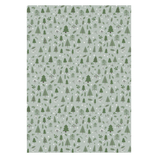 Hübsches Geschenkpapier mit grünem Winterwald von Ib Laursen! 5 Meter auf einer Rolle. Diese Version des Ib Laursen Geschenkpapiers ist besonders nachhaltig, denn sie kommt ganz ohne Plastikverpackung aus.