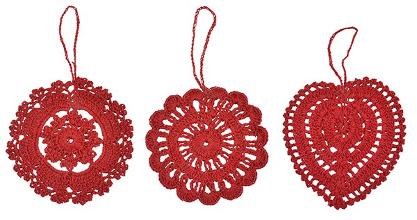 3 süße, gehäkelte Anhänger aus rotem Garn von Ib laursen aus Dänemark.