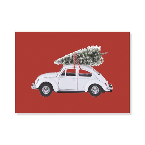 Ein ganz besonderer Tannenbaum on the road! Stylische Postkarte mit rotem Hintergrund und schickem Weihnachtsauto für liebe Grüße zur Weihnachtszeit!