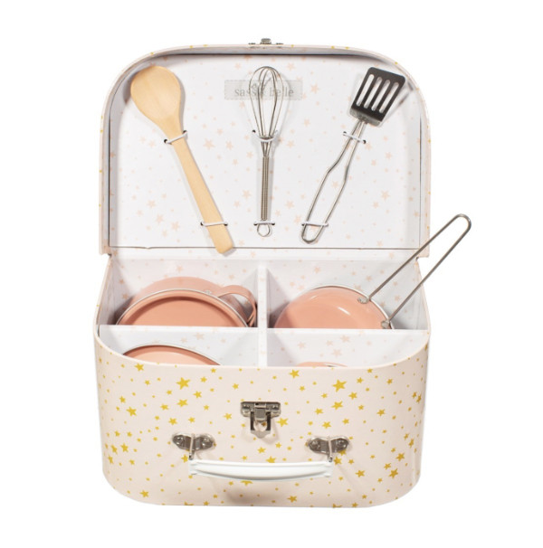 Ein wirklich zauberhaftes Küchen-Spielset das nicht nur Kinder begeistert. Der süße Koffer ist gefüllt mit verschiedenen kleinen Küchenutensilien. Die Unterseite des Koffers sieht aus wie ein Herd. Es kann also direkt losgekocht werden. Material - Laminierte Pappe, Metall, Kunststoff