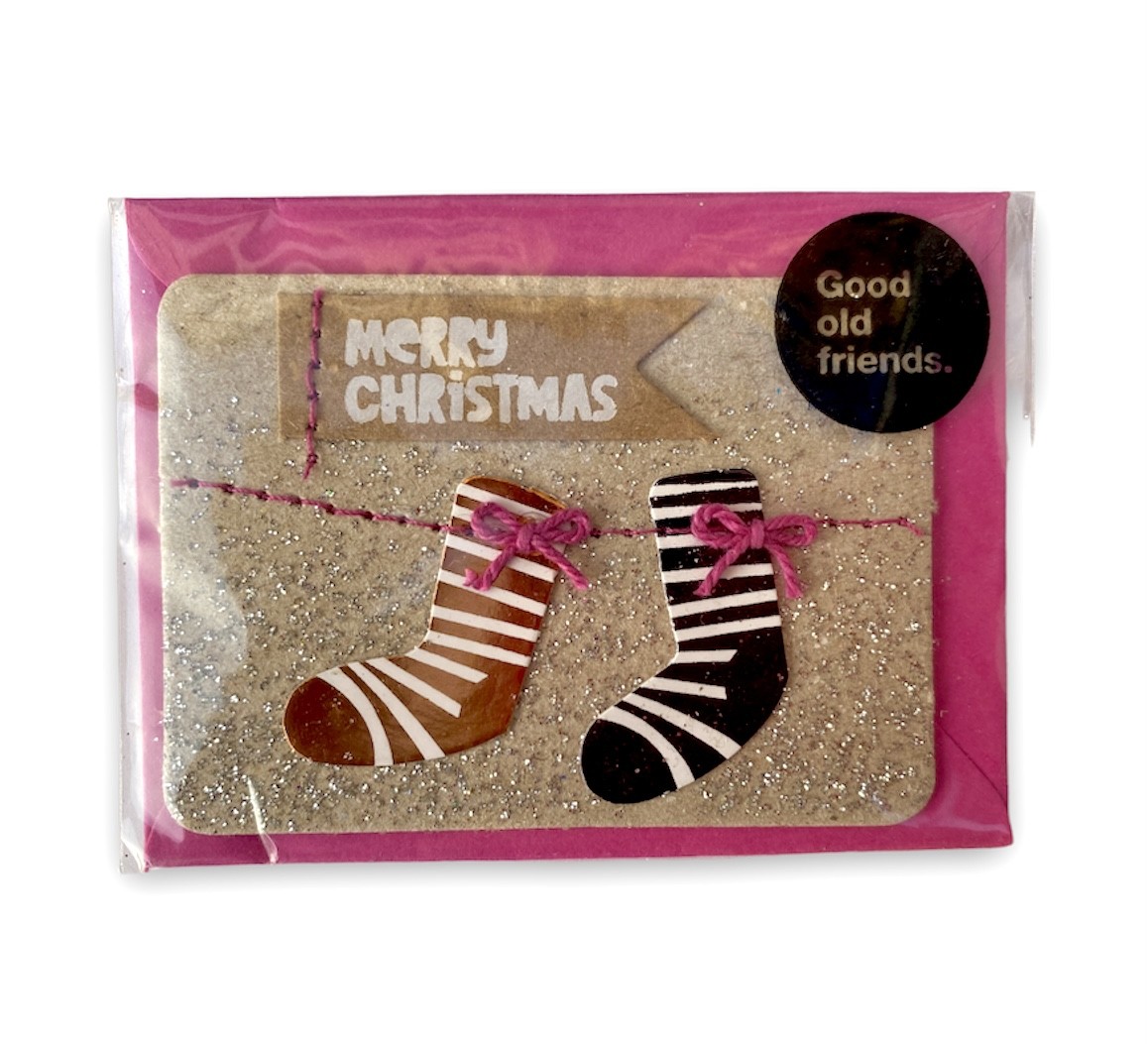 Kleine Karte mit großen Glückwünschen! Liebevoll gestaltete kleine Karte mit süßem Druck und handgemachter Sockenwimpelkette von Good old Friends. Inklusive pinkem Briefumschlag. Material: Karton und Papier