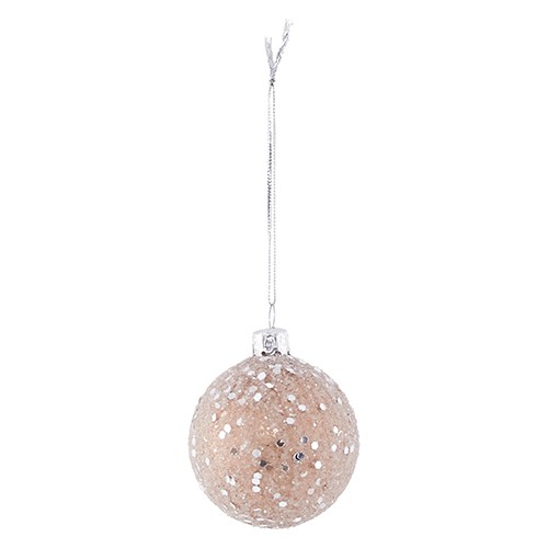 Hübsche, kupferfarbene Glaskugel verziert mit silbergrauem Glitzerstaub und silbernen Glitzer Pailletten und silberfarbenem Bändchen. Glamour pur von House Doctor.