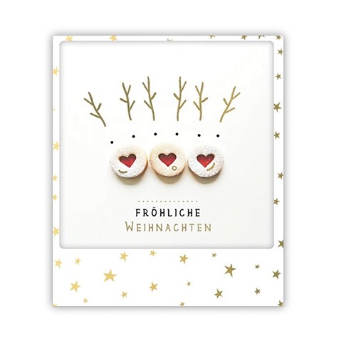 Fröhliche Weihnachten! Wunderschön gestaltete Weihnachtskarte mit niedlichen Rentierkeksen und goldenen Sternen in Vintage Polaroid Optik von Pickmotion.