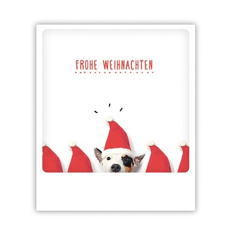 Frohe Weihanchten! Originelle Weihnachtskarte mit roten Weihnachtsmützen in Vintage Polaroid Optik von Pickmotion.