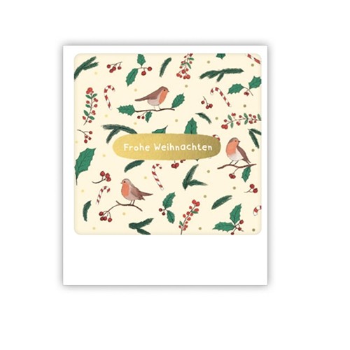 Frohe Weihnachten! Hübsch gestaltete Weihnachtskarte mit kleinen Rotkehlchen und goldenen Verzierungen in Vintage-Polaroid-Format von Pickmotion.