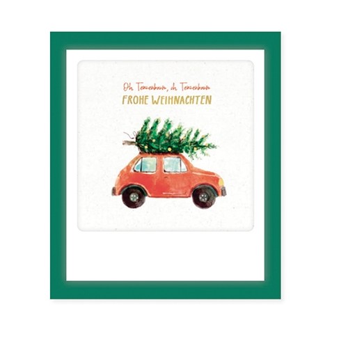 Oh Tannenbaum, Oh Tannenbaum! Frohe Weihnachten! Wunderschön gestaltete Mini Pic Klappkarte mit süßem Automotiv und goldenen Verzierungen in Vintage-Polaroid-Format von Pickmotion. Besonders toll an dieser Klappkarte: die Karte mit dem Fotomotiv lässt sich aus dem Passepartout herausnhemen und somit zum Dekorieren, Aufhängen oder nochmals zum Beschriften verwenden. Also doppelte Freude mit den tollen Pickmotion Klappkarten.