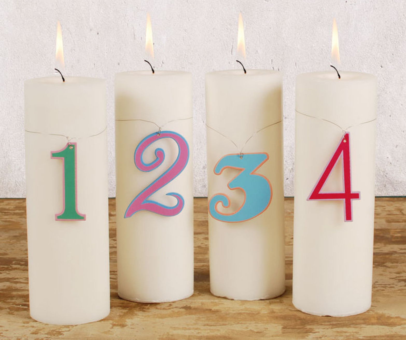 Vier bunte Holzschildchen in Zahlenform von 1-4 von Aspegren aus Dänemark. Perfekt zum Verzieren von Adventskerzen. Aber natürlich auch den Rest des Jahres für andere Gelgenheiten wie Geburtstage geeignet.